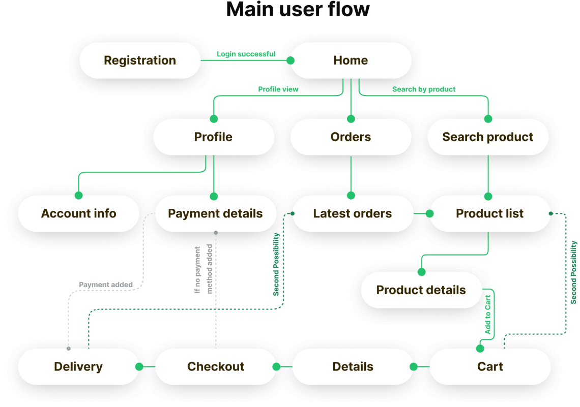 Once I went into my end user’s head, it was time to sketch out the first flows and the initial low-fidelity wireframes, as well as a prototype based on them.Flow diagram