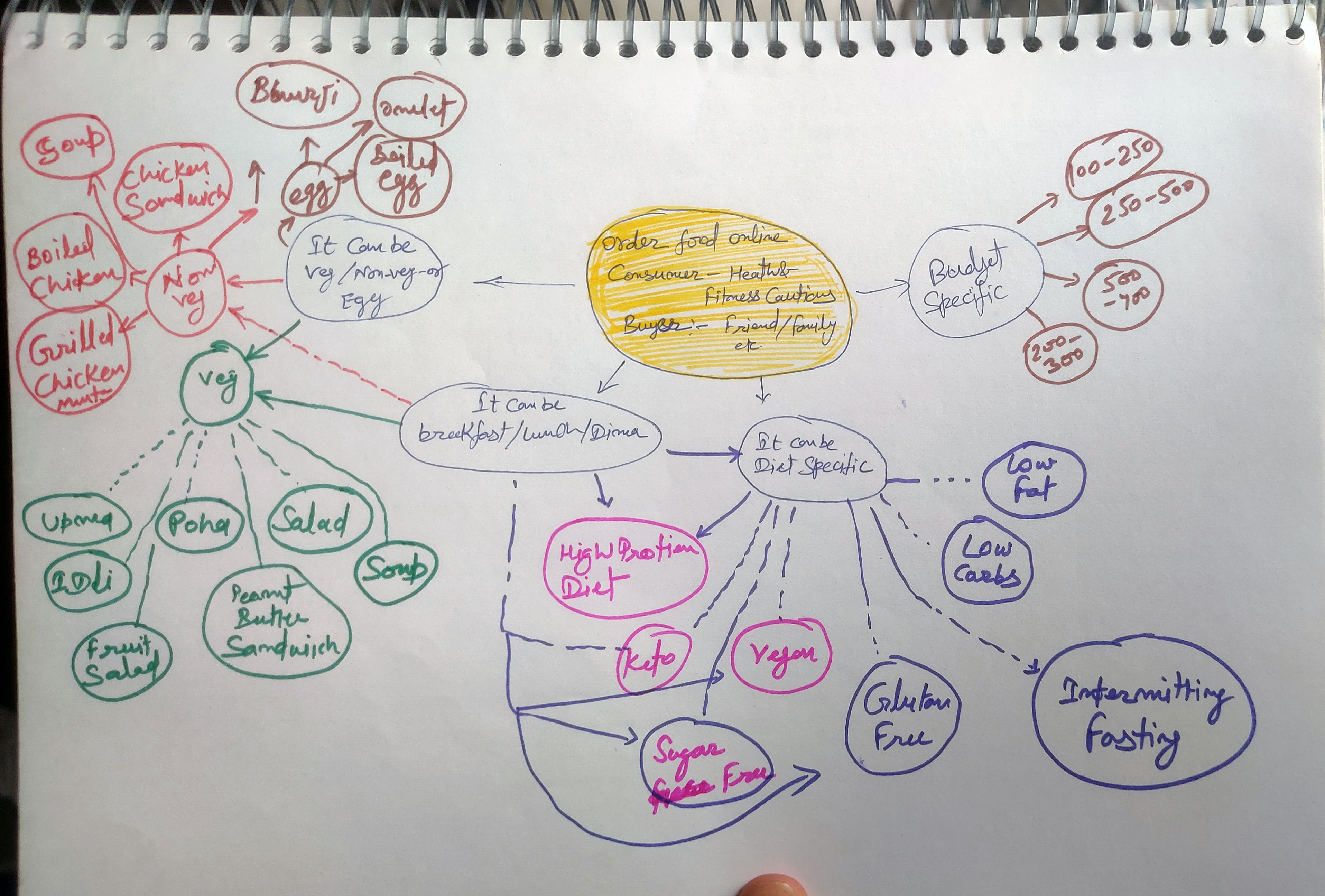 Next, I created a user journey map to identify the pain points and feelings the customer might go through while ordering in the traditional way. I also enlisted solutions to the problems my app would solve.