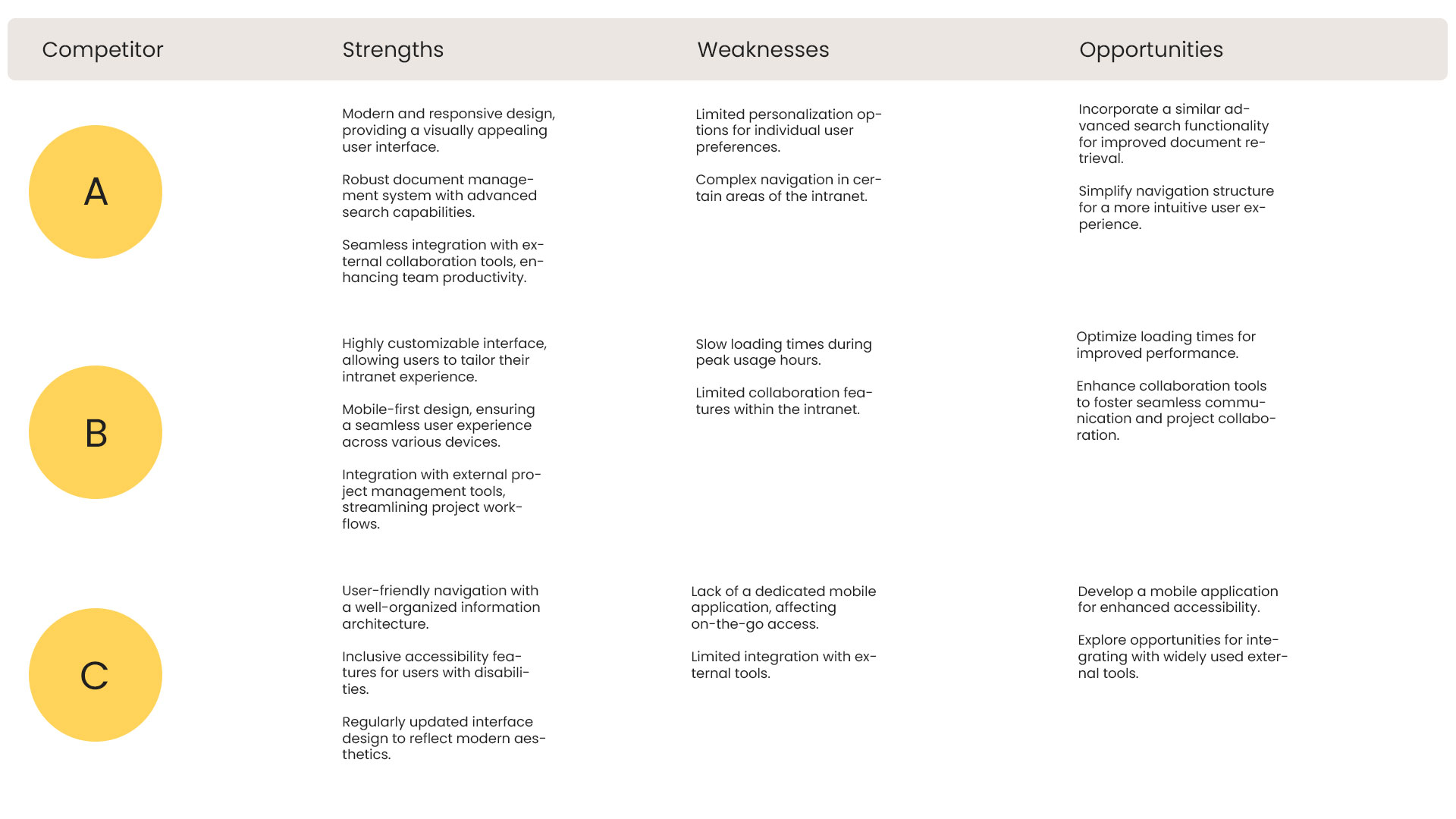 This competitive analysis provides valuable insights for the redesign process, guiding the identification of features and functionalities that can enhance YASH' intranet portal and elevate it to industry standards.