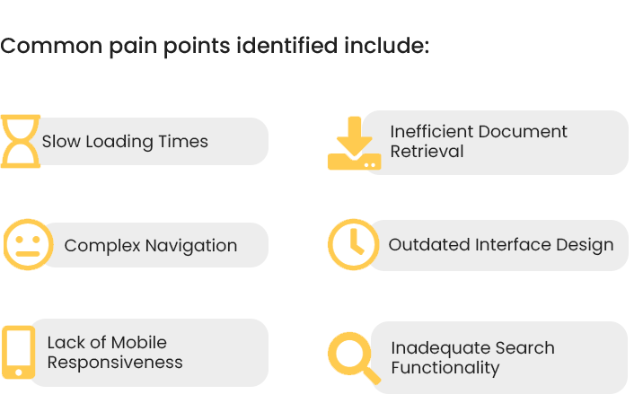 To identify patterns and themes in the data collected from user interviews, surveys, and usability testing, an affinity mapping exercise was conducted. The following clusters represent the common pain points and challenges faced by users on the current intranet portal: