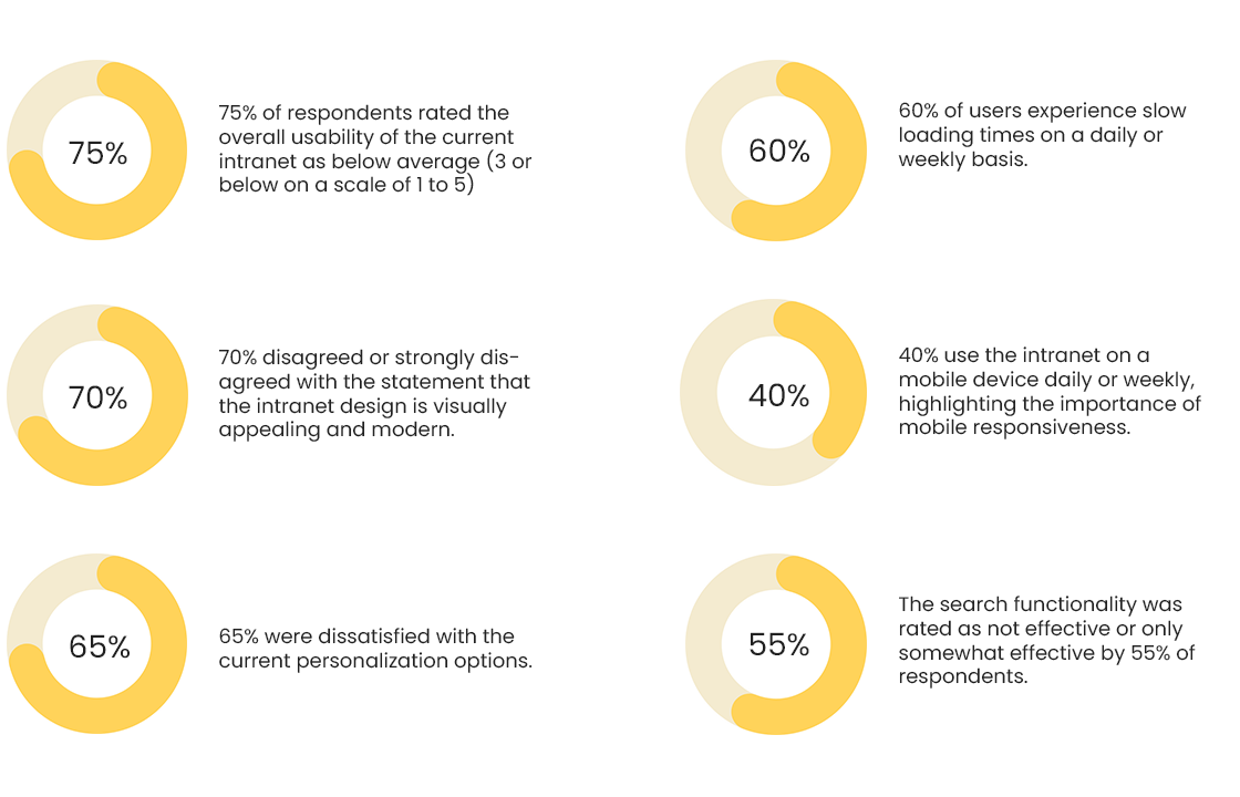 Conclusion: The quantitative and qualitative research provides a comprehensive understanding of user perceptions and experiences with the current intranet. The combination of survey data and interview findings serves as a robust foundation for identifying specific pain points and areas for improvement in the redesign process. This user-centric approach ensures that the redesigned intranet addresses real user needs and aligns with the goals of enhancing usability and overall satisfaction.