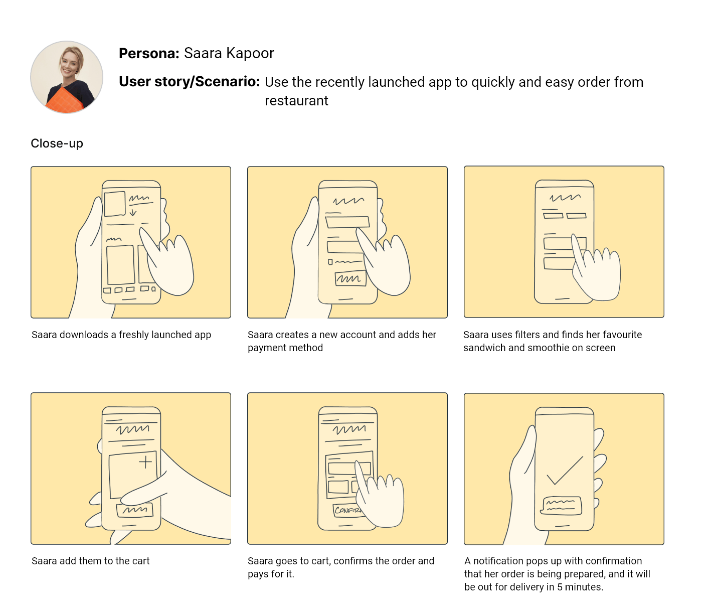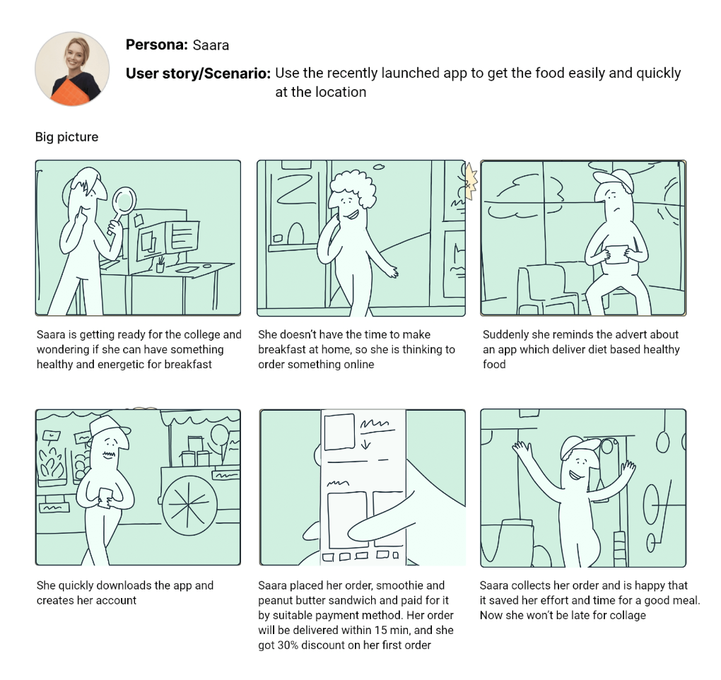 I then designed UX storyboards for one persona to help me visually predict and explore a user’s experience with my app. These were created using Storyboard Mix-and-match Library.