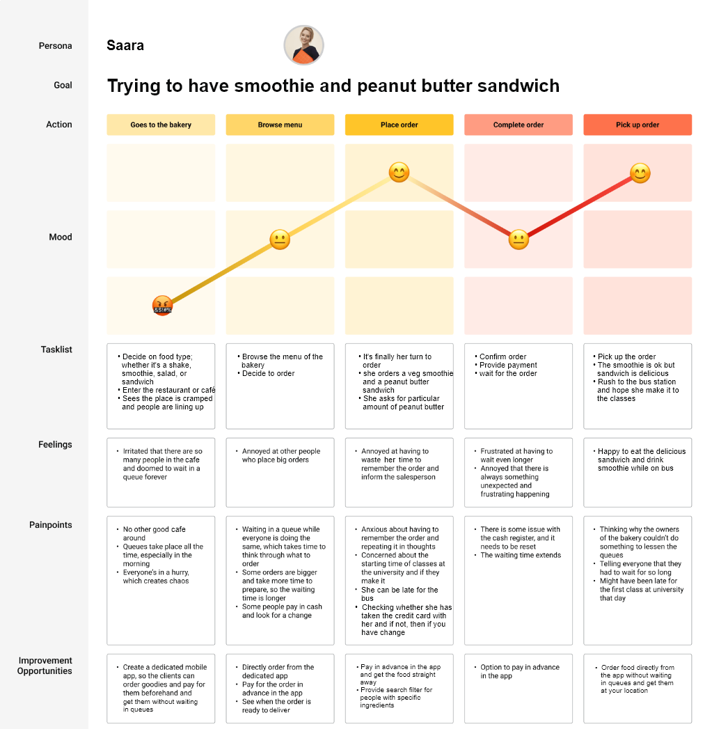 Next, I created a user journey map to identify the pain points and feelings the customer might go through while ordering in the traditional way. I also enlisted solutions to the problems my app would solve.