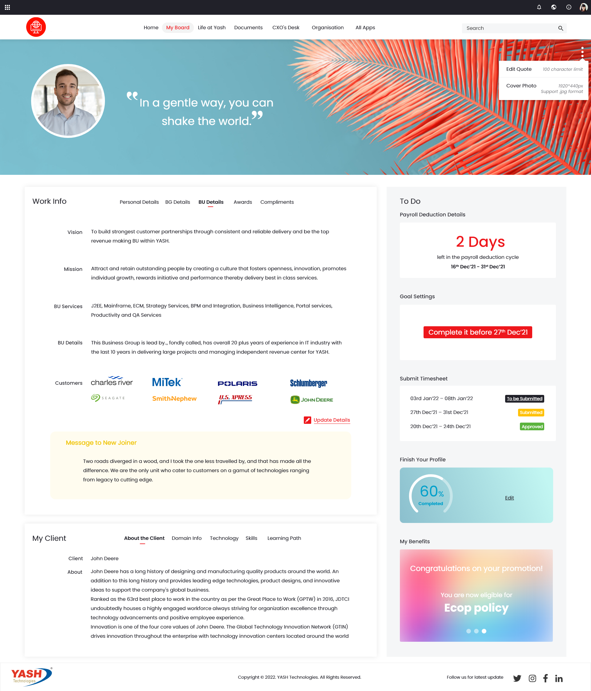 To address these challenges with its outdated intranet we're redesigning YASH Tech.'s intranet to modernize it, improve navigation and ensure better accessibility. Our goal is to boost employee productivity, satisfaction, and overall user experience.