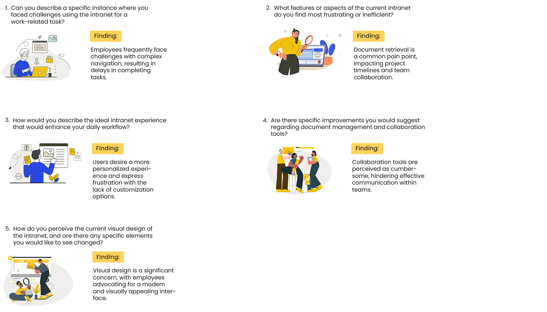 User Interviews: Conducted in-depth interviews with 15 employees from different departments, aiming to gather qualitative insights into their experiences, challenges, and suggestions related to the intranet.