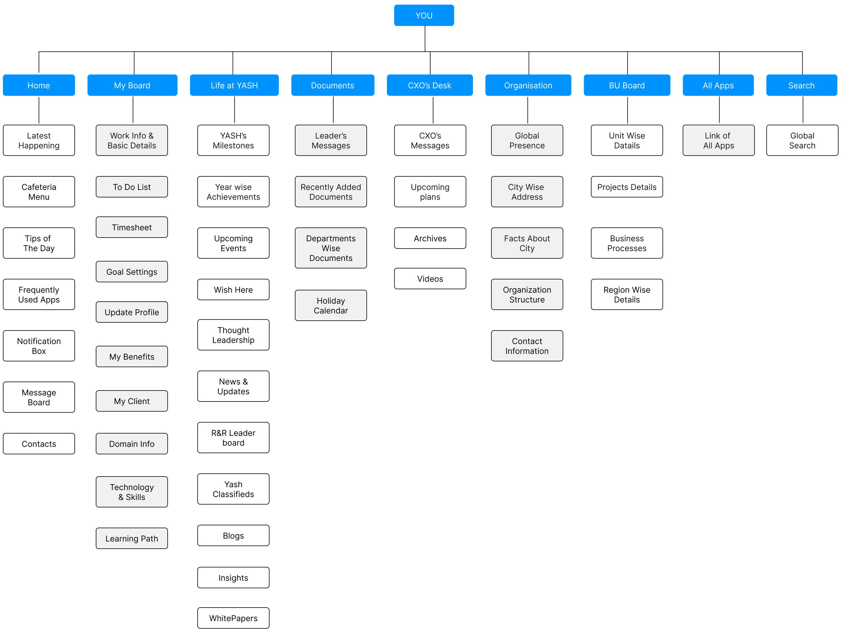 The revised sitemap aims to provide a structured and intuitive navigation experience for users, covering personalized dashboards, company updates, executive communications, organizational information, and access to a variety of applications. The inclusion of "My Board," "Life at YASH," "CXO's Desk," "Organization," and "All Apps" ensures that users can easily access relevant information and tools, contributing to a more user-friendly and engaging intranet experience.
